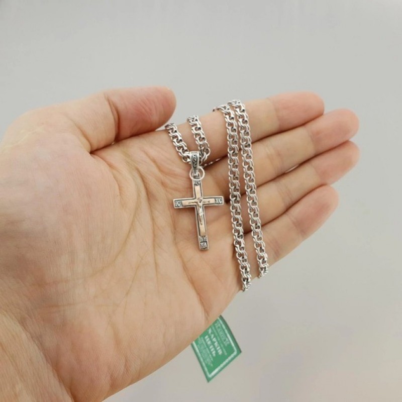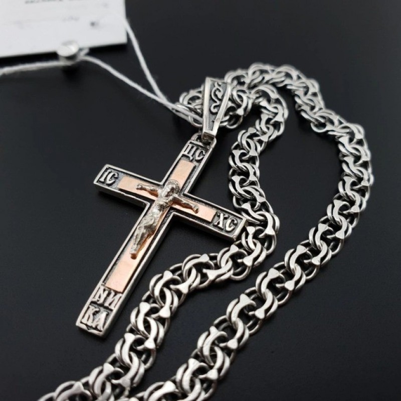 Xarkov istehsalı, qızıl detallar və qaraltma ilə bəzədilmiş kişi gümüş zəncir və xaç dəsti, uzunluğu