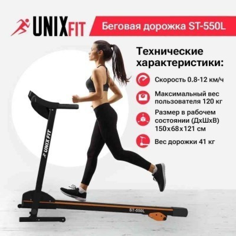 Главной особенностью беговой дорожки UNIX Fit ST-550L является увеличенное беговое полотно размером 120 на 42 сантиметра. Максимальная скорость бега на данной модели составляет 12 км/ч. Система амортизации с 6 эластомерами существенно снизят нагрузку на суставы. Угол наклона бегового полотна регулируется вручную и составляет 10%.
